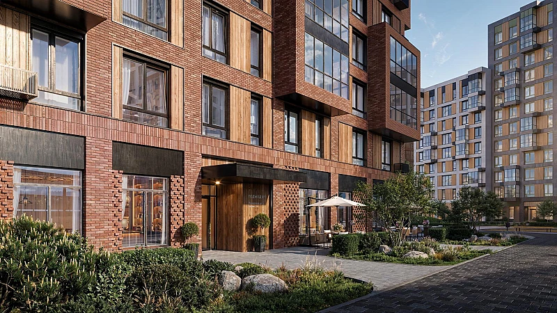 Корпуса высотой 9–12 этажей и 14–17-этажные башни украшают деревянные панели. На входе в подъезды не будет ступеней и высоких порогов. После прогулки велосипеды и коляски можно оставить в местах хранения.