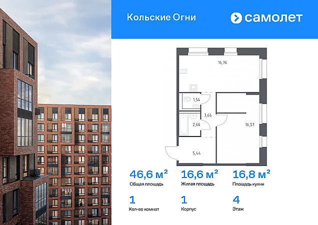 Строим кварталы для жизни с заботой о будущем. Предлагается 1-комнатная квартира комфорт-класса 46,63 кв.м в корпусе 1 на 4 этаже, в ЖК «Кольские Огни»