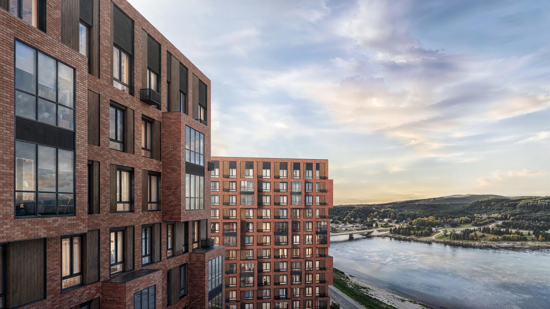 Корпуса высотой 9–12 этажей и 14–17-этажные башни украшают деревянные панели. На входе в подъезды не будет ступеней и высоких порогов. После прогулки велосипеды и коляски можно оставить в местах хранения.