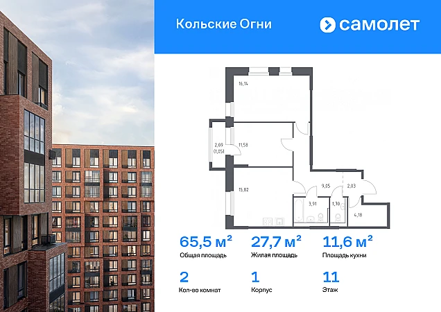 Строим кварталы для жизни с заботой о будущем. Предлагается 2-комнатная квартира комфорт-класса 65,46 кв.м в корпусе 1 на 11 этаже, в ЖК «Кольские Огни»