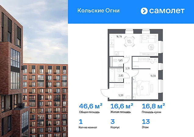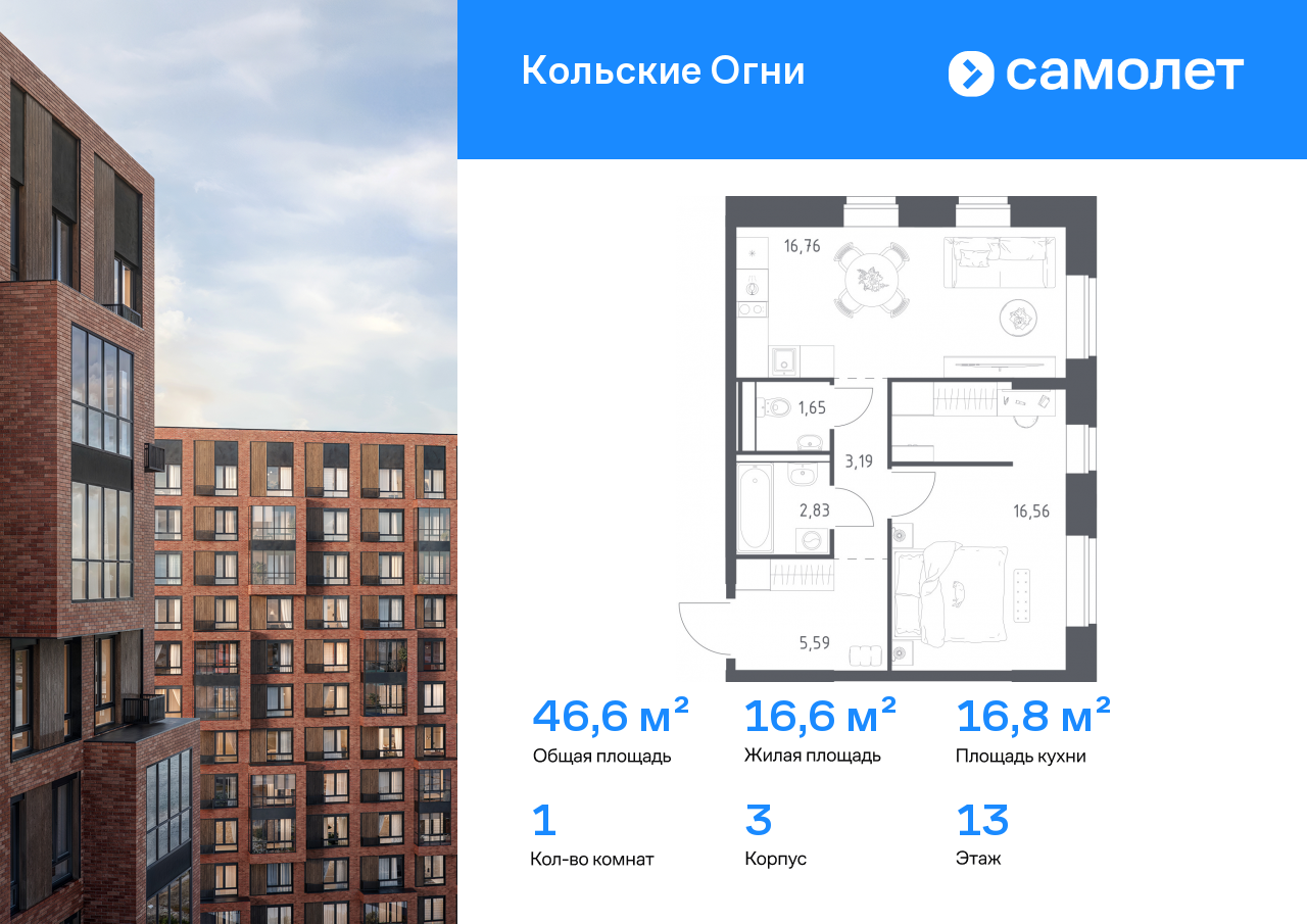Строим кварталы для жизни с заботой о будущем. Предлагается 1-комнатная квартира комфорт-класса 46,58 кв.м в корпусе 3 на 13 этаже, в ЖК «Кольские Огни»